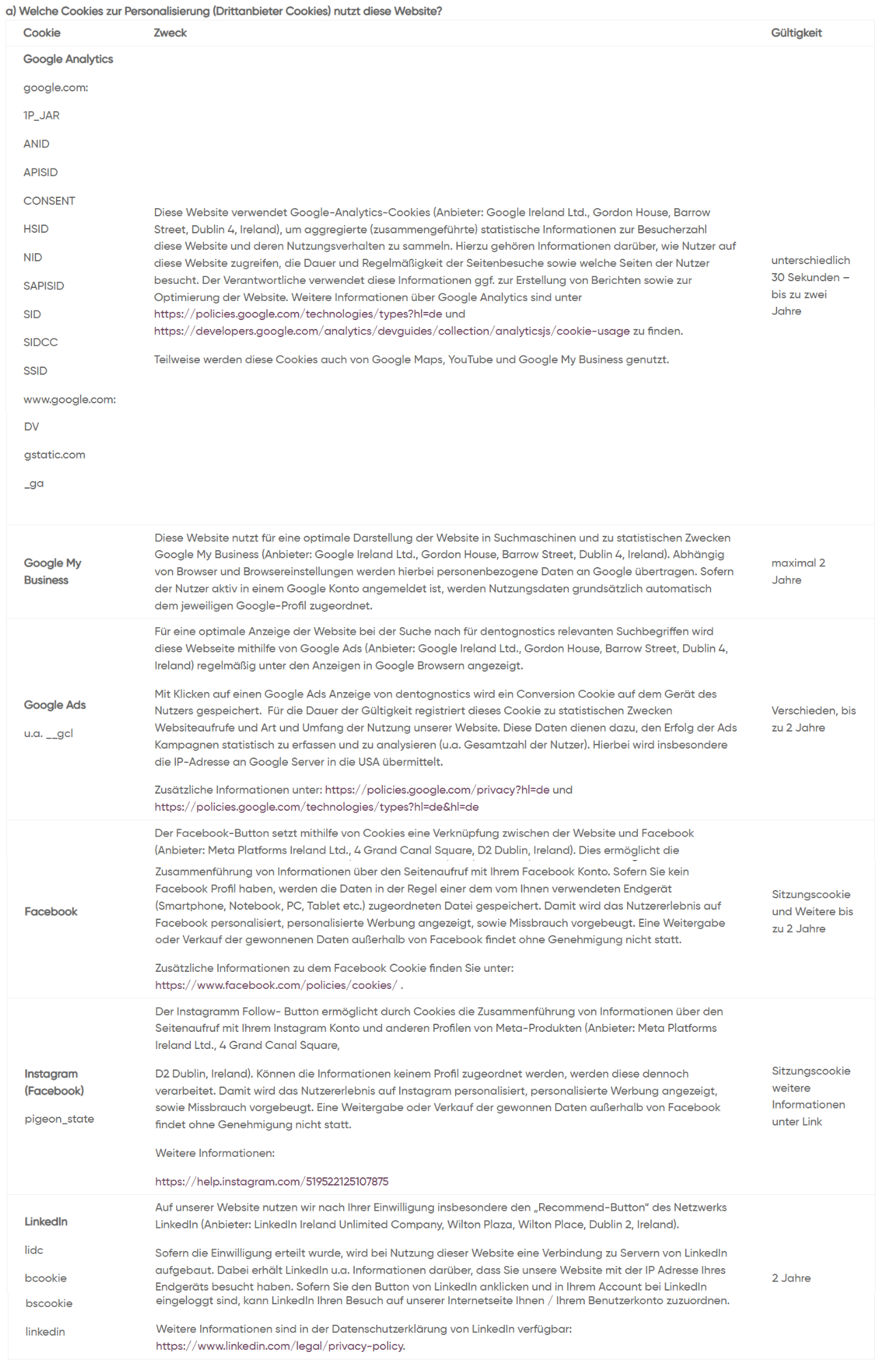 | Google My Business | Diese Website nutzt für eine optimale Darstellung der Website in Suchmaschinen und zu statistischen Zwecken Google My Business (Anbieter: Google Ireland Ltd., Gordon House, Barrow Street, Dublin 4, Ireland). Abhängig von Browser und Browsereinstellungen werden hierbei personenbezogene Daten an Google übertragen. Sofern der Nutzer aktiv in einem Google Konto angemeldet ist, werden Nutzungsdaten grundsätzlich automatisch dem jeweiligen Google-Profil zugeordnet. | maximal 2 Jahre |